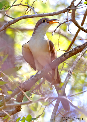 Twenty yards on the trail again, I round a bend and flush a largish bird, ani size but not as dark. It lands at the top of a tangle of branches over the path, in the shade and backlit, not a good scenario for a successful bird photograph and, honestly, I’m not even sure what it is I’m seeing.. I walk slowly under it, making the photo possibilities even worse, but my line of sight is now free of some of the clutter of vegetation. I reconize the bird’s sleek profile, the long tail, and the bright orange base of the decurved bill, and the camera comes up! I have never been this close to a Yellow-billed Cuckoo, nor have I ever even seen one before in Texas.