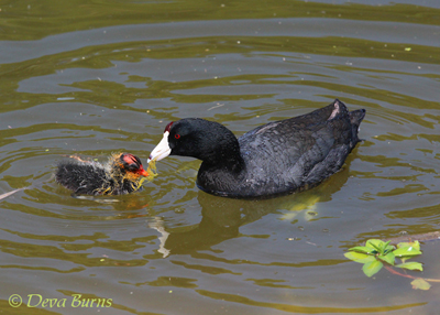 Here’s your anthropomorphism alert—American Coot babies are precious. They are precocial and capable of swimming at six hours after hatching. Initially they are fed animal matter brought to the nest, but upon leaving the nest they begin picking at floating, filamentous plant material. Like grebes, fledgling coots will ride on parents’ backs. The parents are attentive and protective, no surprise as ubiquitous as the species is. I was able to observe the youngsters through the dog days of summer as they grew and gradually lost their bright pinfeathers and scarlet-orange bills.