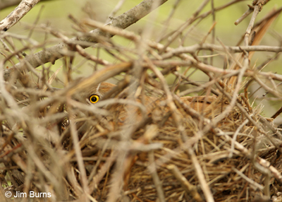 If all else fails, focus manually but then switch back to auto focus before shooting. This may seem either illogical or redundant, but many times I’ve focused manually only to discover on the computer my eye was a little off. Then again sometimes I think I’m right on manually, switch back to auto focus, and see a slight shift which is always a bit sharper. It’s as if focusing first manually puts the focal point close enough to the bird’s general area to allow the lens to then achieve sharp focus by itself. Both the Anna’s and the closing image of a Brown Thrasher on its nest were obtained in this way.