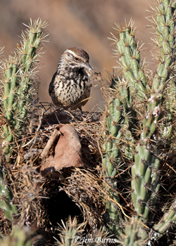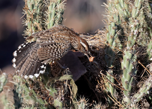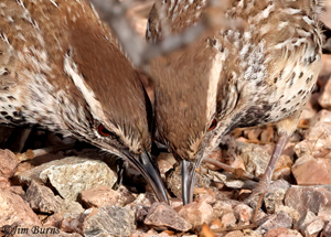 Cactus Wrens are thought to mate for life, and most of their daily activity is spent foraging on the desert floor. Though they consume more plant food than other wrens, in January my pair spent the early morning hours, before nest construction, inserting their bills under rocks, flipping them over, and searching for spiders, moths, and insect grubs. Typically they worked the same area, but only occasionally did they work side by side, probably because when one found an insect, it ran away with it or the other would try to steal it, something I saw on more than one occasion.