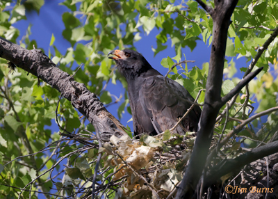 We eat and pack up, but still puzzled by what we’ve seen and heard, we walk the canyon’s rim one more time. We see or hear no hawks on the way to the nest overlook. Once there we raise the glasses and are blown away by what we see. There on the edge of the nest, all by itself, is a single chick standing almost as tall as an adult. It still has pinfeathers on its head and there is no color yet on its face or striping on its underparts. Four to five weeks old we guess, and by the appearance of its flight feathers it is not yet capable of flight. How could it not have been seen in the nest yesterday? How had we missed it?